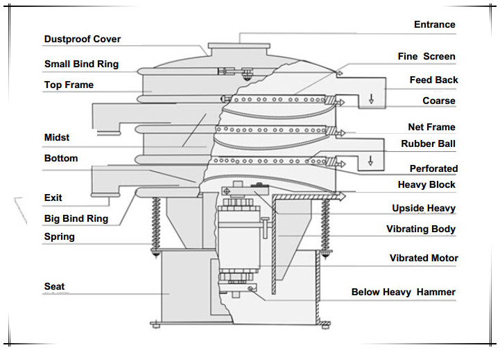 Rotary Vibration screen is designed as a high-precision screening machinery. Rotary vibration screen is composed of vertical motor,and eccentric weight installed at two ends.We can produce horizontal, vertical, inclined motions by adjusting the upper and lower eccentric weight.Diameter can be ranged from 400mm to 2000mm, with single or multiple screening decks(1-5 layers).Material can be divided into all carton steel,contact part stainless steel and all stainless steel.